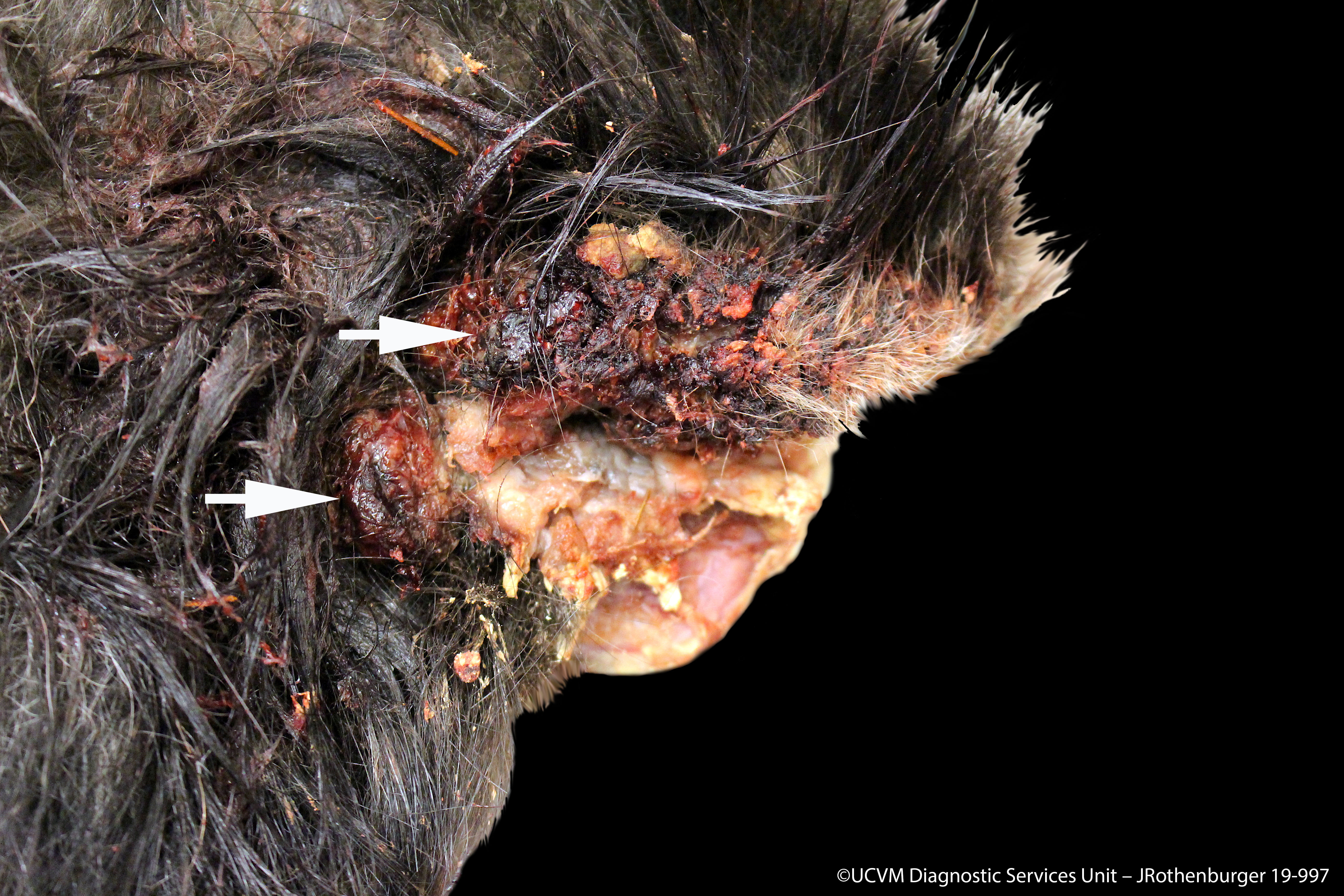 Primary infection of contagious echthyma (Orf virus) causing a proliferative dermatitis and cheilitis. Damage to skin barrier leading to secondary bacterial infection primarily characterized by Corynebacterium freneyi, causing suppurative lymphadenitis and cellulitis of the head eventually leading to terminal septicemia.