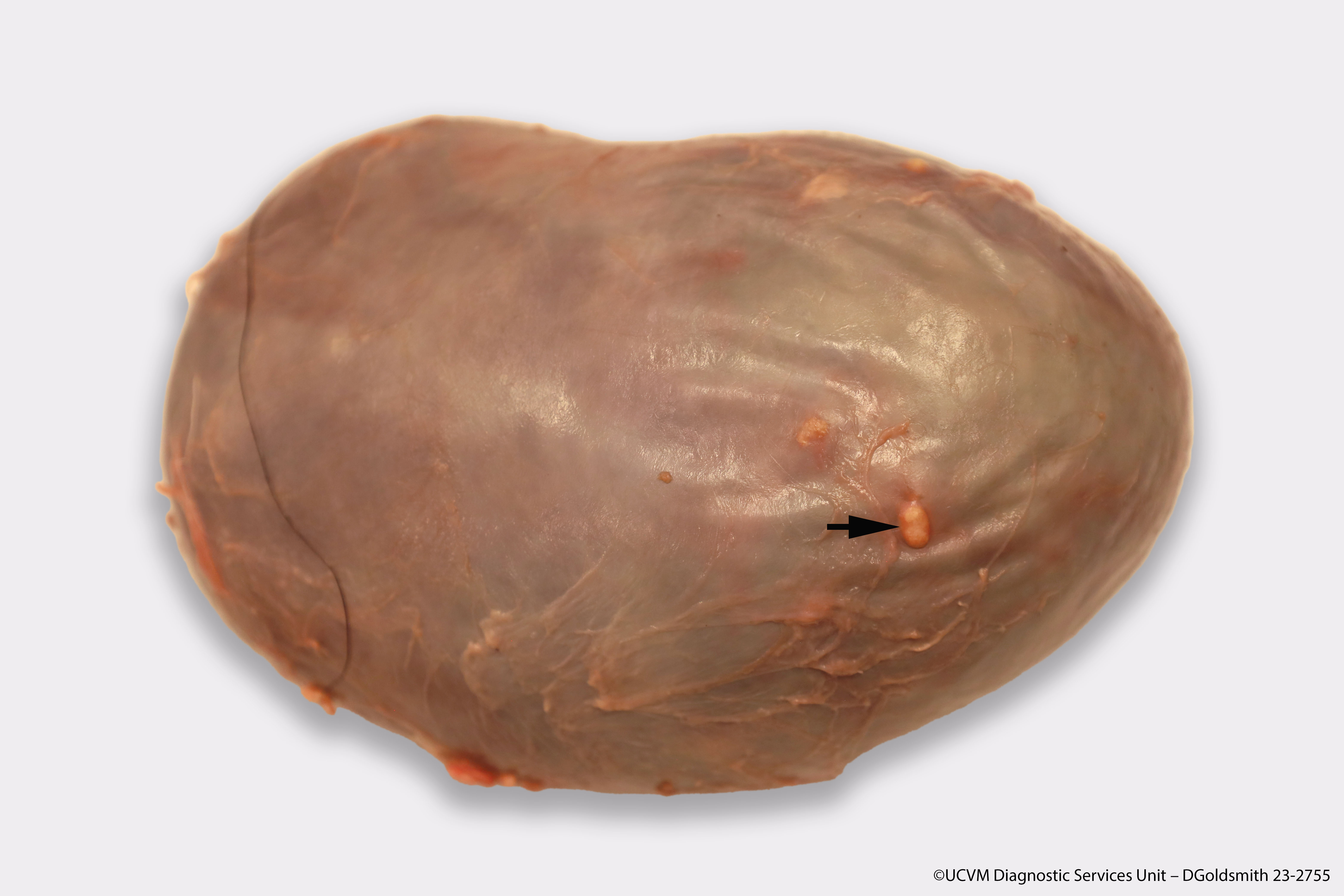 The kidney appears to have a thickened covering layer ("capsule"), which indicates that a long-term disease damaged it. There are also multiple white spots, caused by the Brucella infection