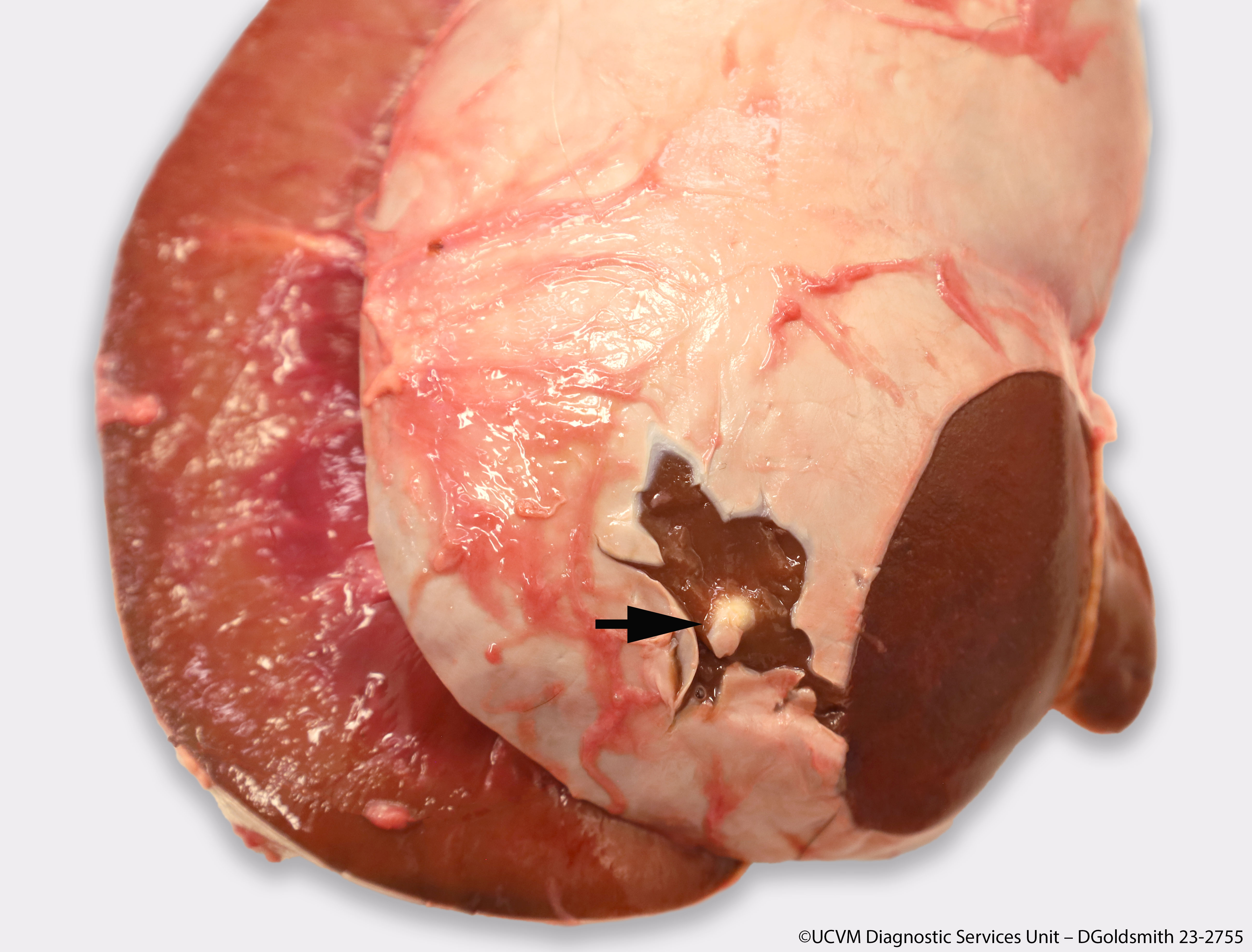The kidney appears to have a thickened covering layer ("capsule"), which indicates that a long-term disease damaged it. There are also multiple white spots, caused by the Brucella infection