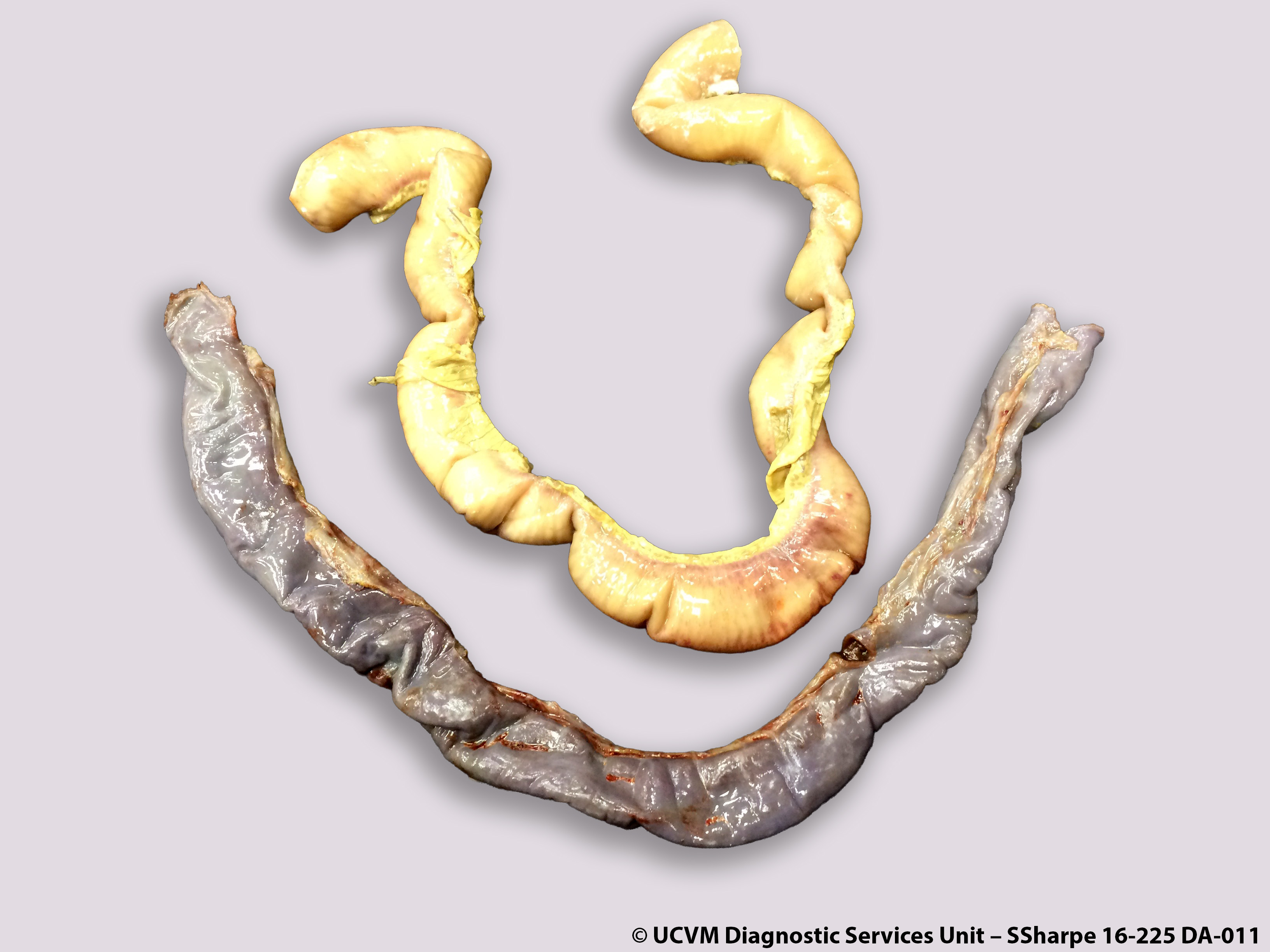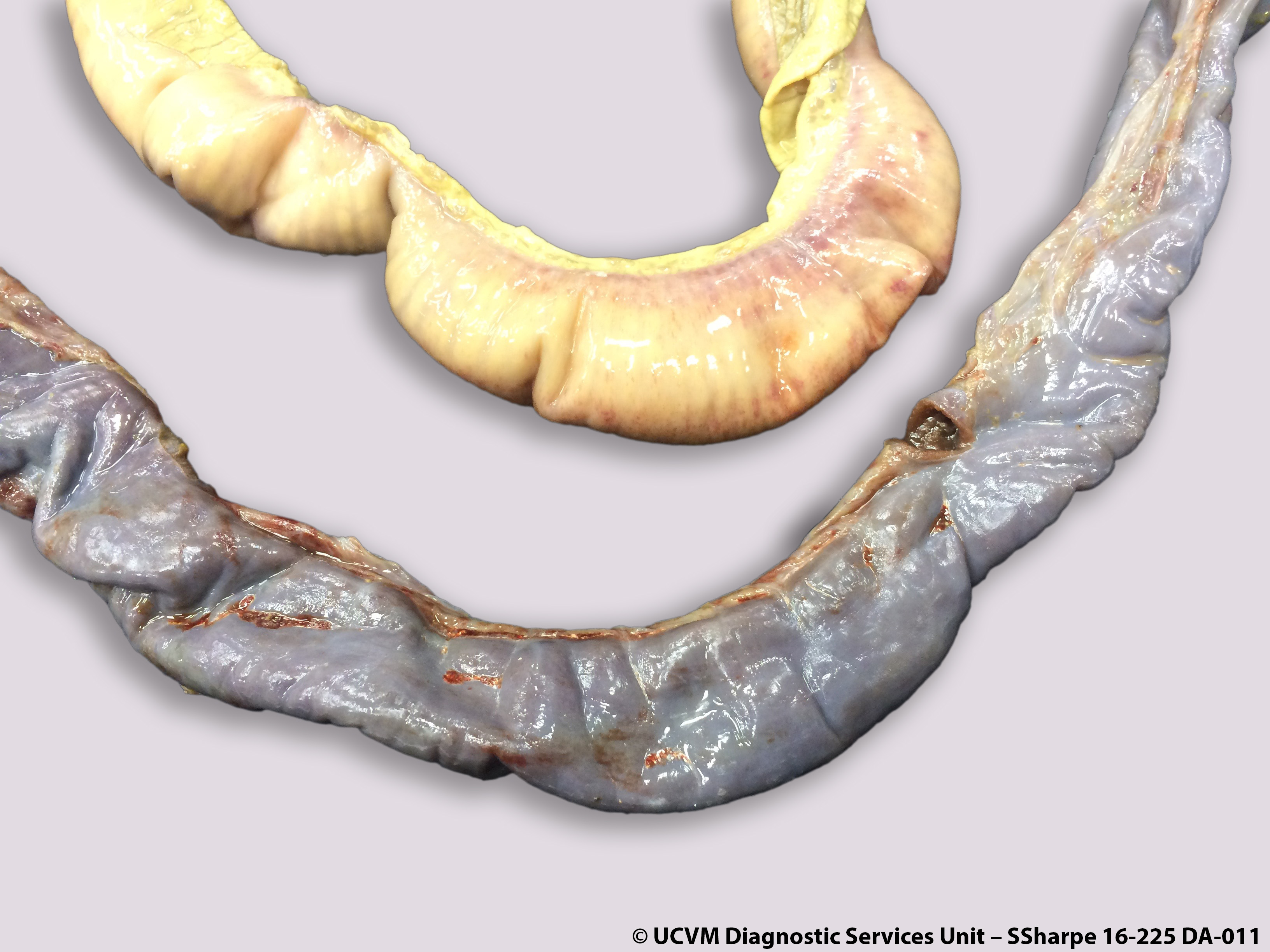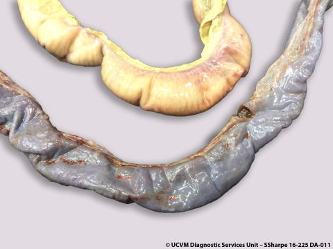 Shown: Mesenteric volvulus with mucosal infarction, with normal small intestine for comparison