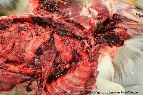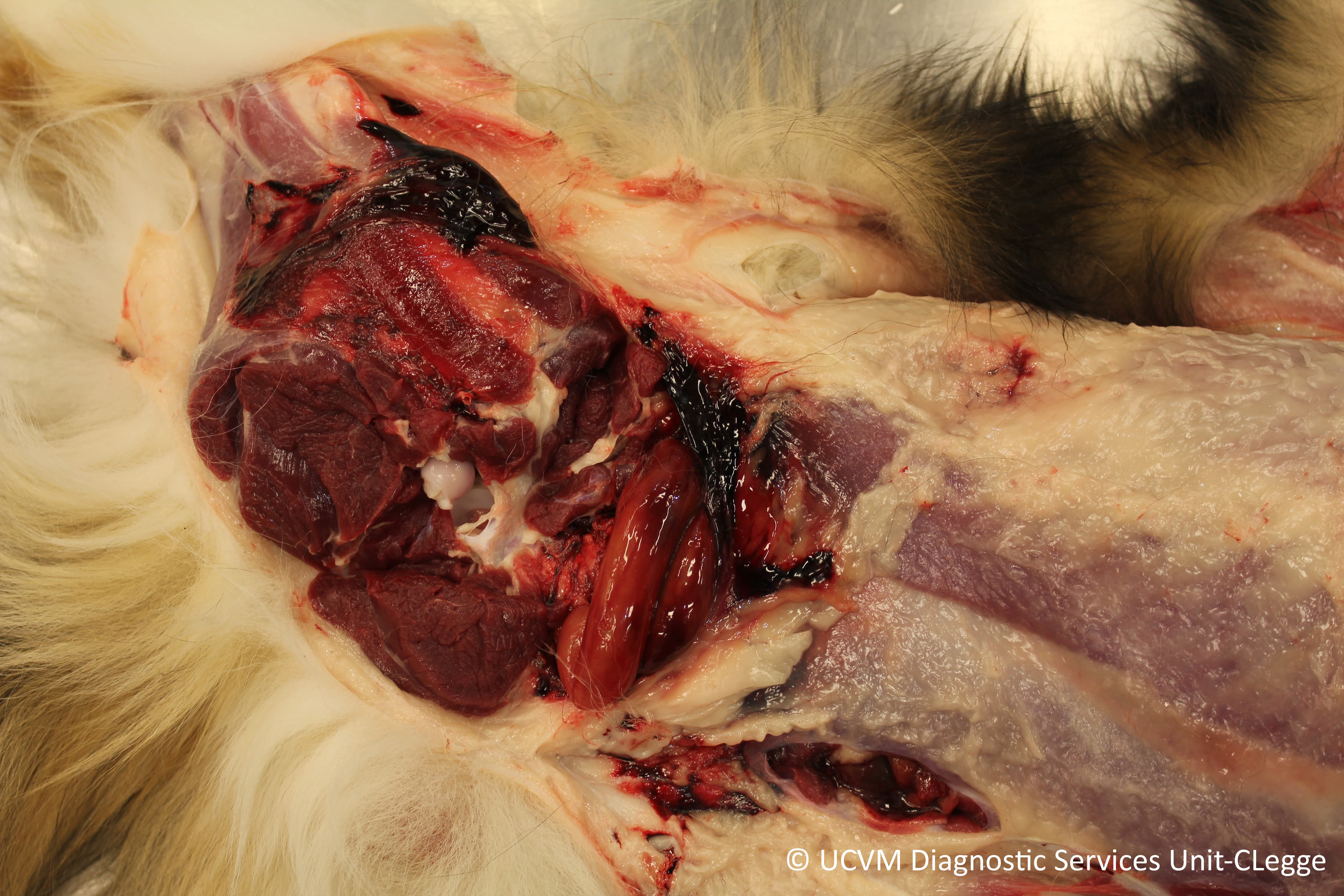 Ruminant, Bovine (calf): Peritoneum. Peritonitis following abomasal perforation in a calf with clostridial abomasitis.