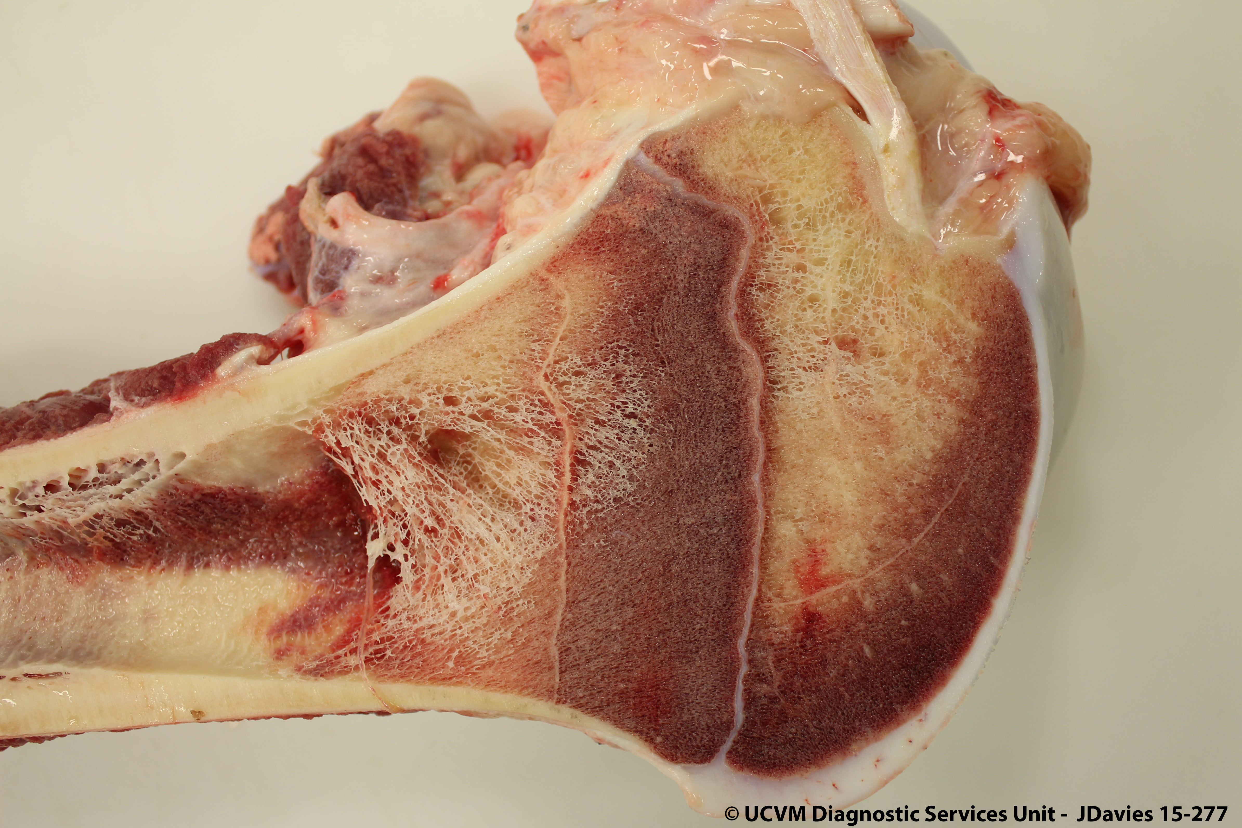 Ruminant, Bovine: Humerus. Caseonecrotic osteomyelitis caused by Mycoplasma bovis.