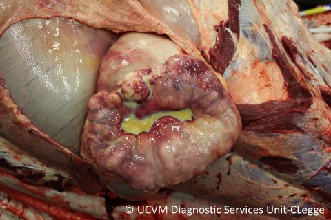 Ruminant, Bovine: Humerus. Caseonecrotic osteomyelitis caused by Mycoplasma bovis.